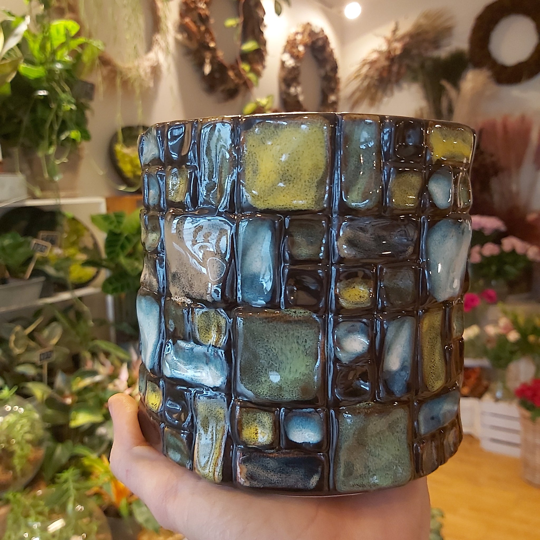 Veldig flott krukke som virkelig komplimenter en stilig plante. Siden de er håndmalte er det små variasjoner på hver enkelt krukke. Kommer i to størrelser.