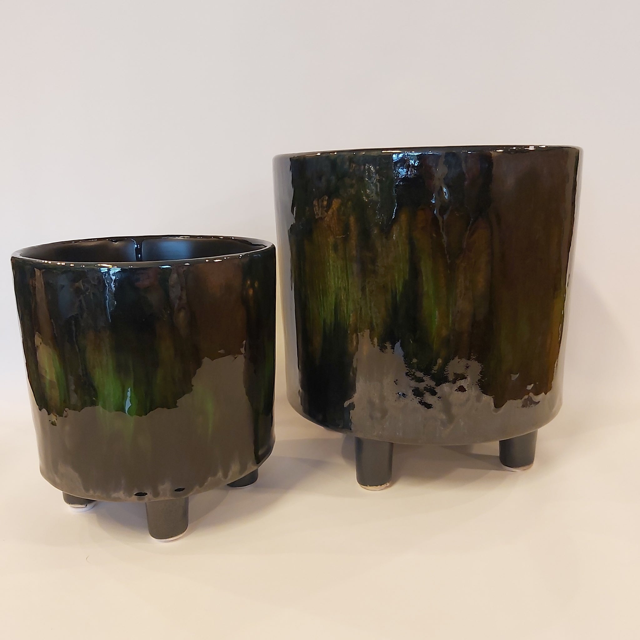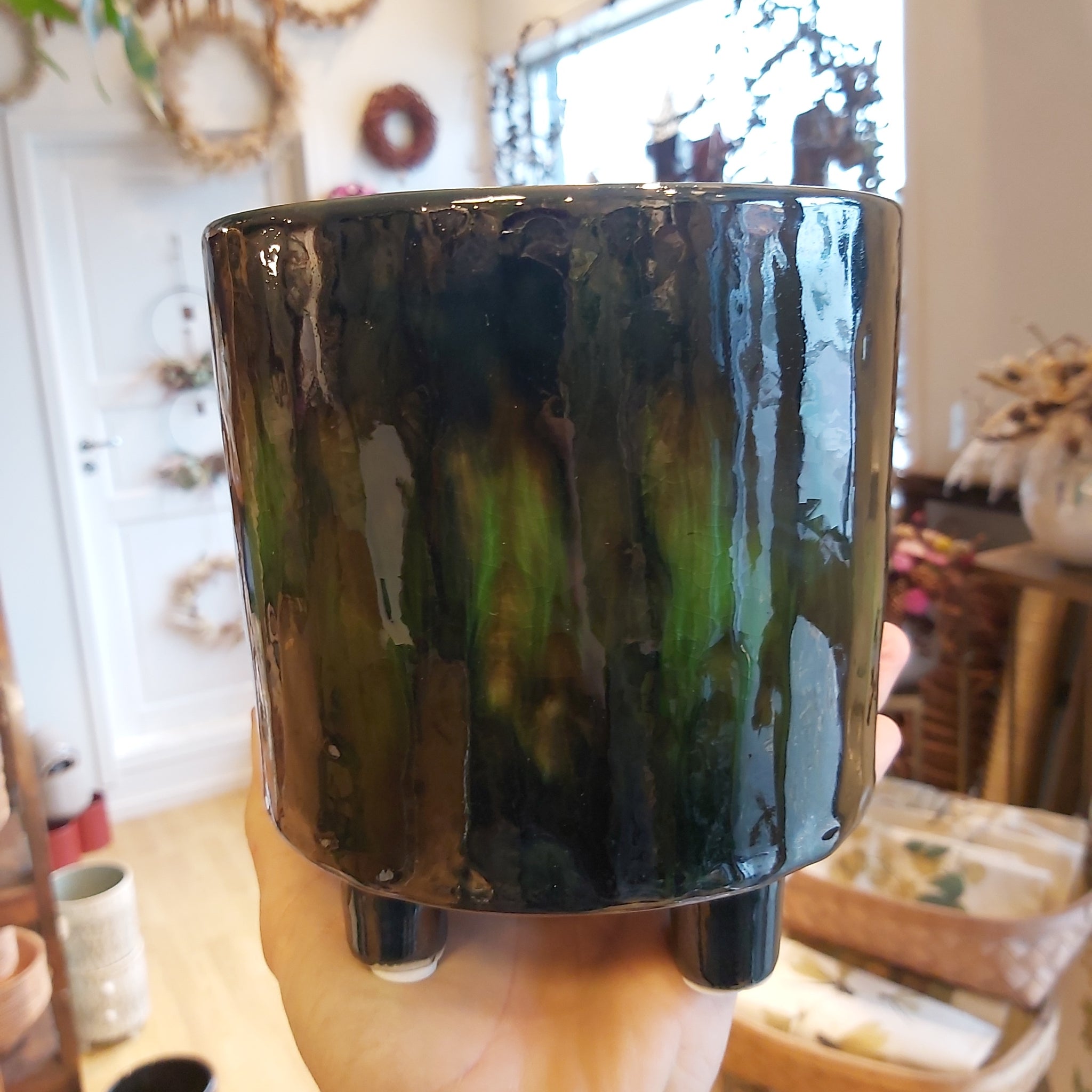Pene krukker i svart og grønn nyanse. Krukken har tre føtter, og kommer i to størrelser.