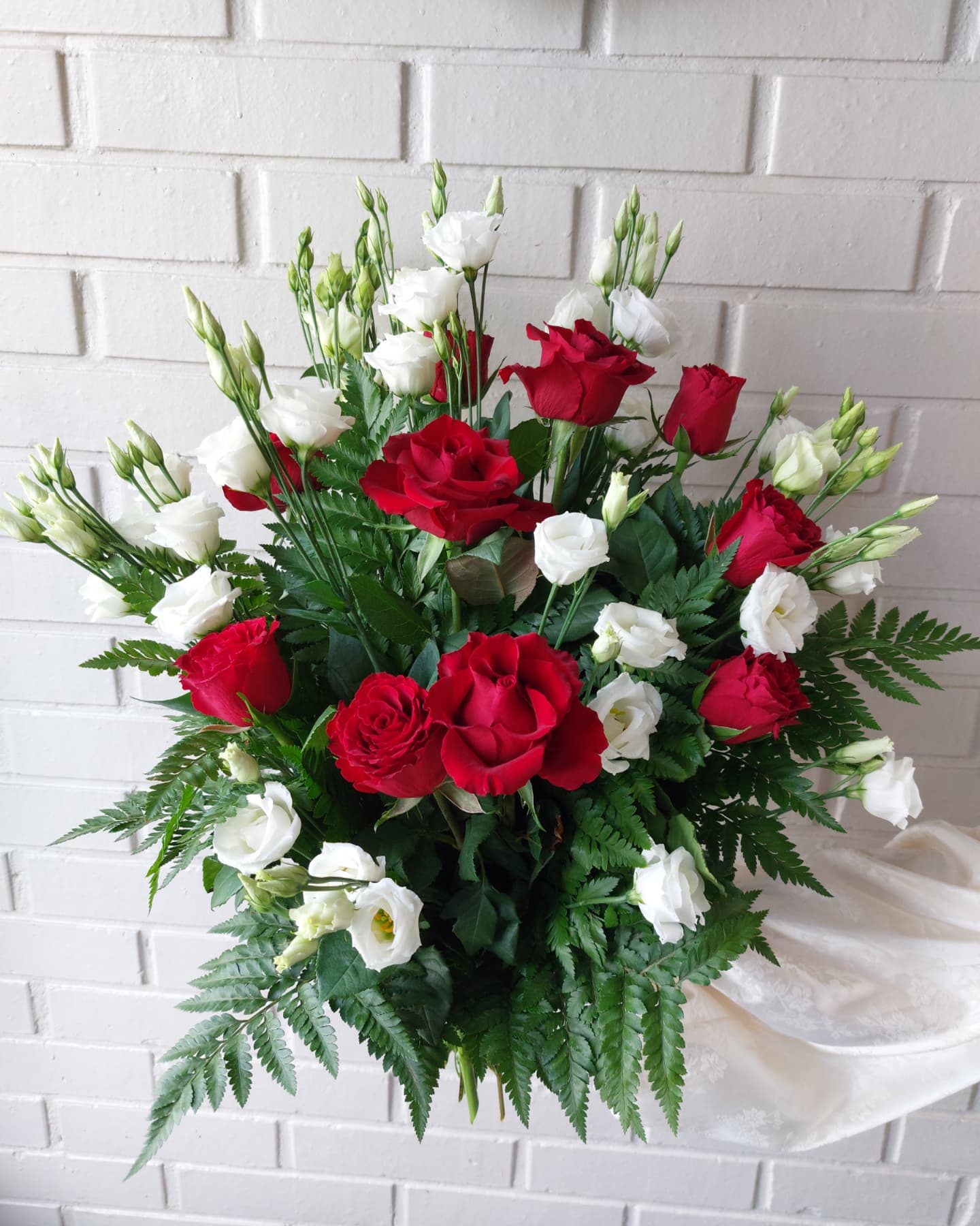 Bårebuketter blir bundet i en form som gjør at denne kan både stå i en vase og ligge på en pidestall/gulv.